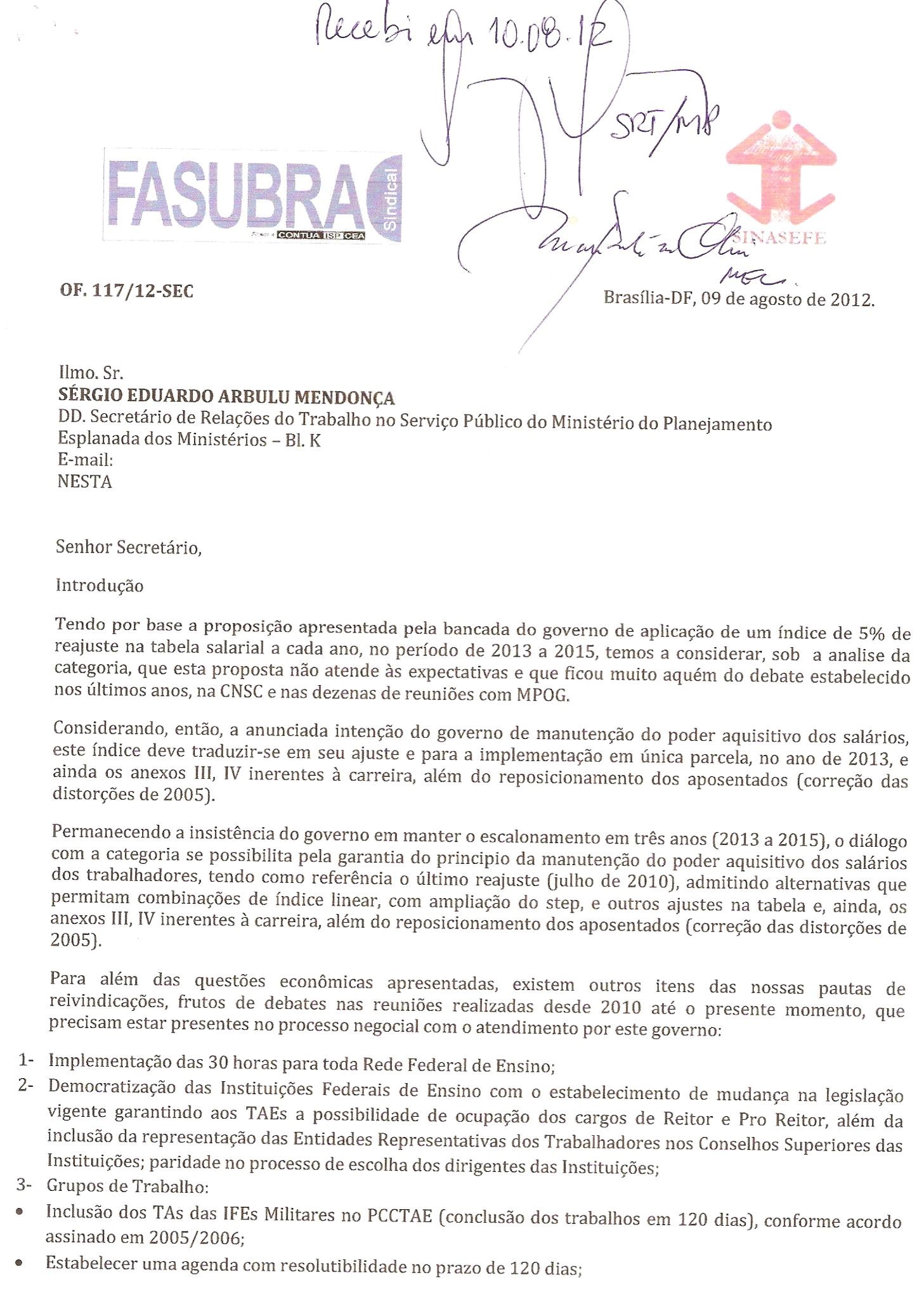 CONTRAPROPOSTA APRESENTADA PELA FASUBRA, NA ÚLTIMA SEXTA-FEIRA, DIA 10 DE AGOSTO