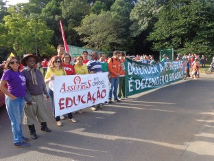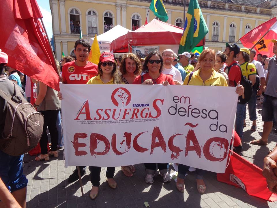 Assufrgs participou de Ato que reuniu 7 mil pessoas em defesa da democracia, contra a retirada de direitos e contra a privatização da PETROBRAS. Exibindo faixa “Assufrgs em defesa da educação”, militantes associaram a luta pela PETROBRAS estatal a luta pela valorização dos técnico-administrativos em educação.