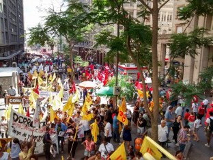Intersindical e CSP/Conlutas, que também concentraram militância no Paço Municipal na manhã de hoje, fizeram caminhada em separado do Ato da CMS. Reivindicavam a luta contra o arrocho e pelos direitos da classe trabalhadora. Militantes da Assufrgs também participaram desse Ato.