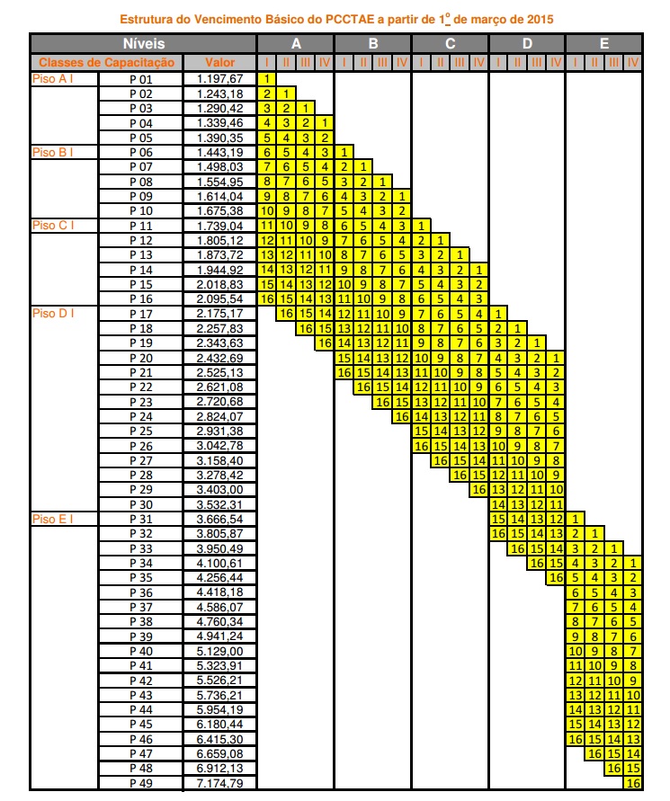 O acordo de greve de 2012 está chegando ao final. A última parcela dos 15% será realizada neste mês (março) para os técnico-administrativos em educação. Para entender como fica seu salário, clique na tabela abaixo.