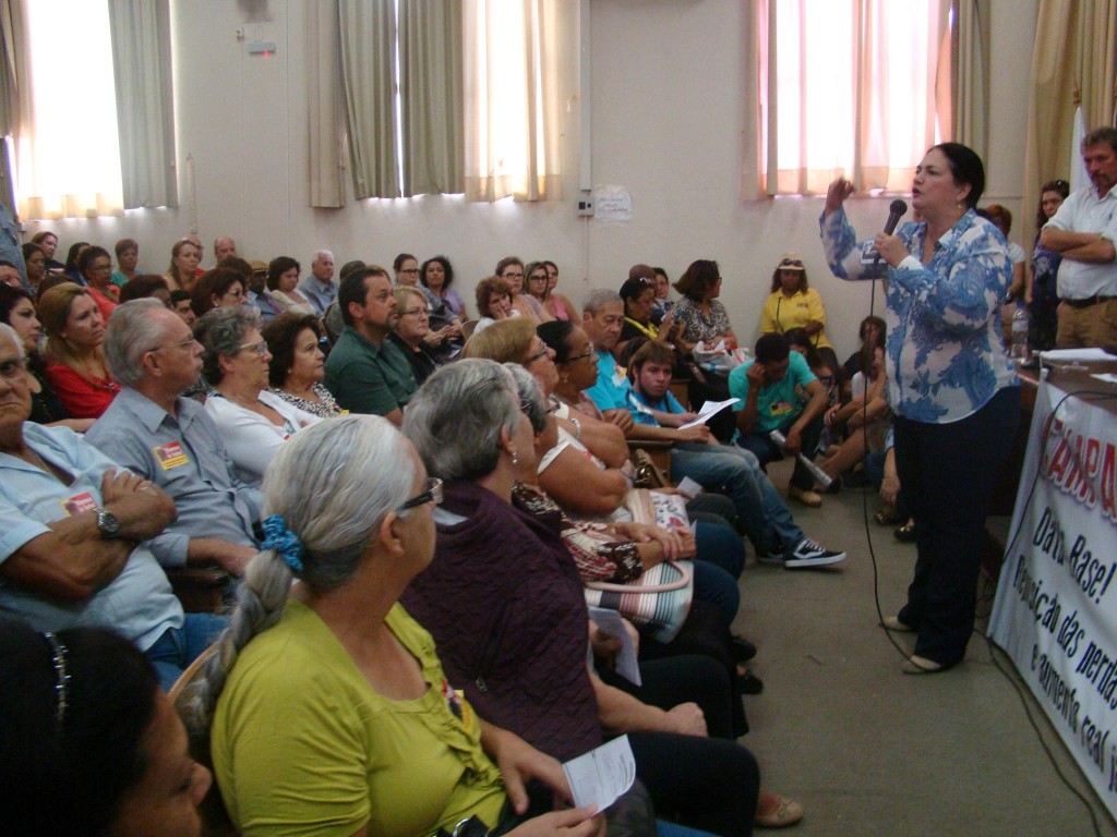 A primeira tese apresentada, conforme sorteio realizado na Assembleia, foi da chapa Vamos à Luta – Peleia e Independentes. A Coordenadora da Assufrgs Bernadete Menezes defendeu a necessidade de os trabalhadores se localizar na conjuntura. No caso do serviço público, o patrão é o governo. Falou sobre a resistência dos trabalhadores frente ao governo e citou o dia de paralisação nacional 15 de abril como exemplo de luta, barrando aspectos do PL 4330 da terceirização. “Conseguimos tirar o serviço público. O projeto foi para a plenária já sem o serviço público, por pressão do nosso movimento. Também, conseguimos tirar as estatais, foi muito importante tirar a Caixa Econômica e o Banco do Brasil. Mas, os destaques seguem em votação. Ontem, tivemos uma vitória, unimos todo mundo, de quem defende e não defende o governo, mas que queria defender os interesses da classe trabalhadora. Vitória que foi adiar para a semana que vem a votação”, disse Bernadete.