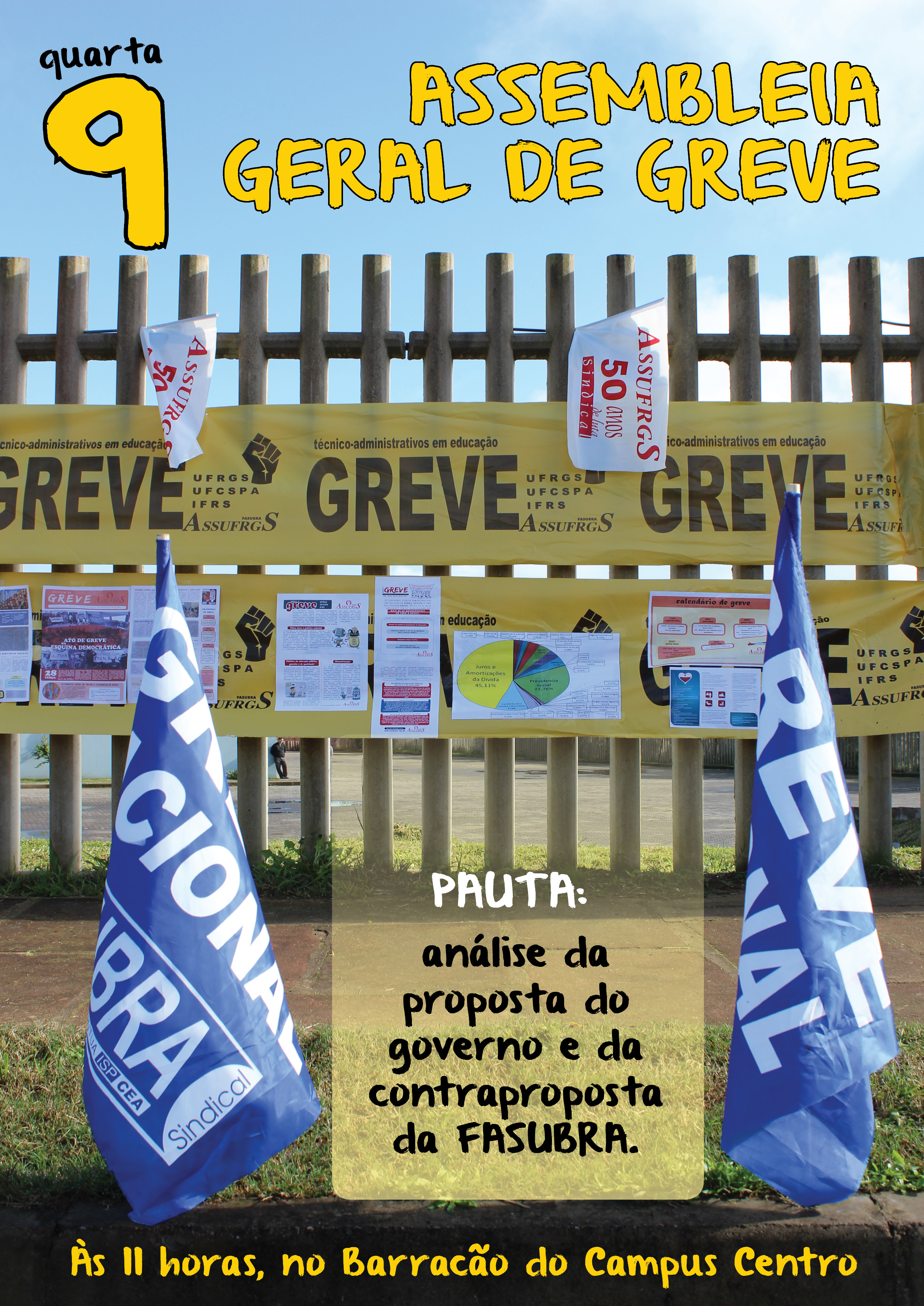 A Assembléia Geral de greve foi antecipada em razão do andamento das negociações da Fasubra com o MPOG. Será nesta quarta-feira (09), às 11h, no barracão.