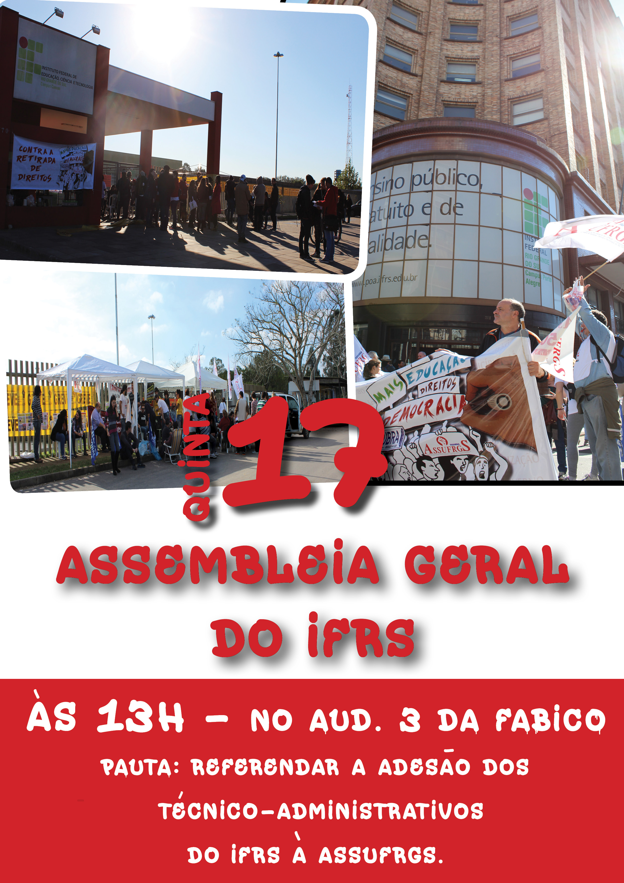 Na próxima quinta (17), será realizada Assembleia geral dos técnico-administrativos do IFRS, às 13 horas, no Auditório 3 da Fabico.