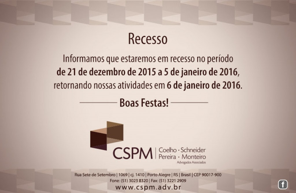 Notícia Recesso Escritorio CSPM – assessoria jurídica 10 de dezembro de 2015 Imprensa Assufrgs Confira o período de recesso da assessoria jurídica da Assufrgs pelo Escritório CSPM.