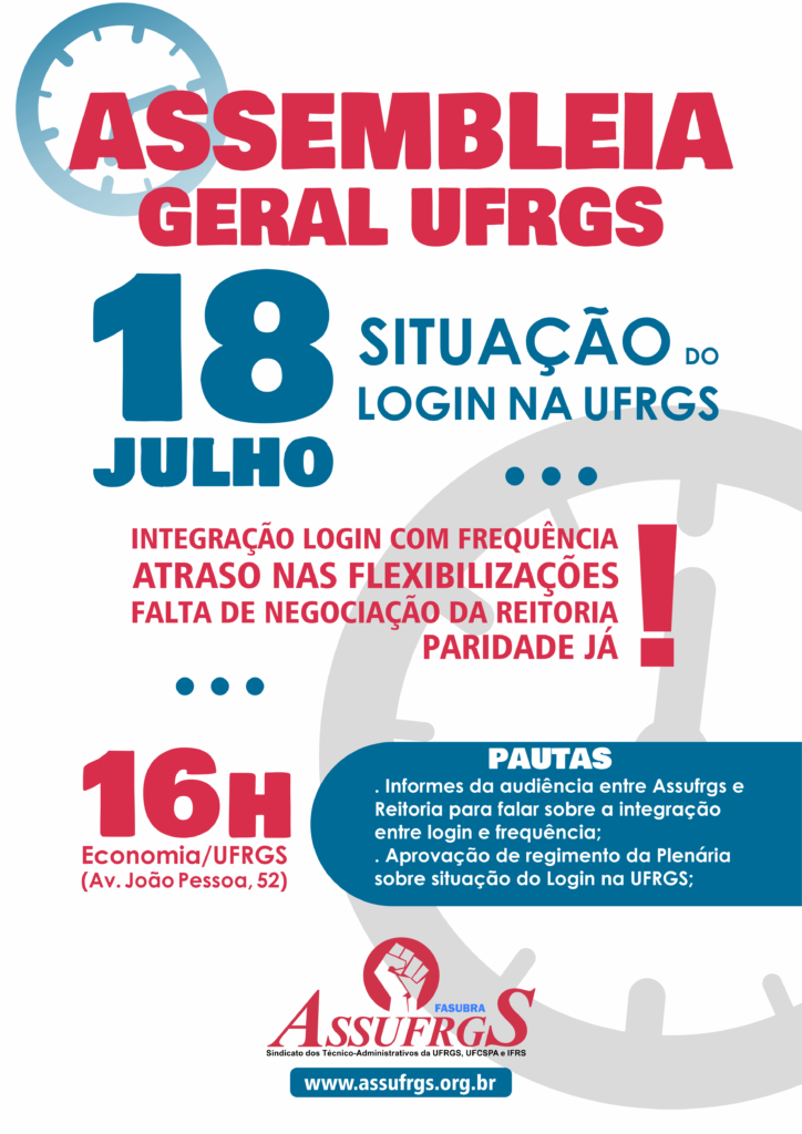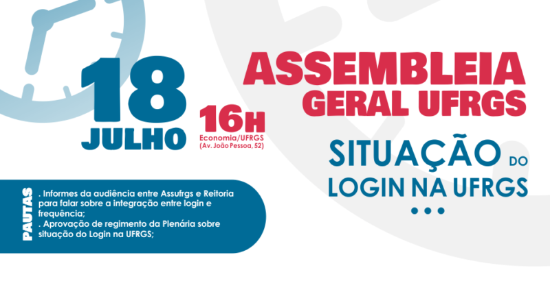 A Assufrgs Sindicato convoca os colegas da UFRGS para a Assembleia Geral da categoria que discutirá a situação do login na universidade!A assembleia ocorre no dia 18 de julho, às 16h, no auditório da Faculdade de Economia da UFRGS (Avenida João Pessoa, 52)