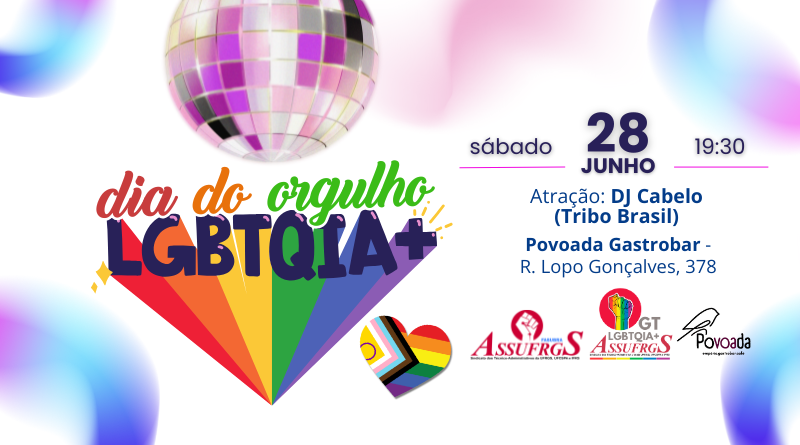 A ASSUFRGS Sindicato realizará no próximo sábado, dia 28 de junho, uma celebração pelo Dia Internacional do Orgulho LGBTQIA+. O evento ocorrerá no Povoada Gastrobar (Rua Lopo Gonçalves, 378), a partir das 19h30min. A atração musical será o DJ Cabelo (Tribo Brasil).