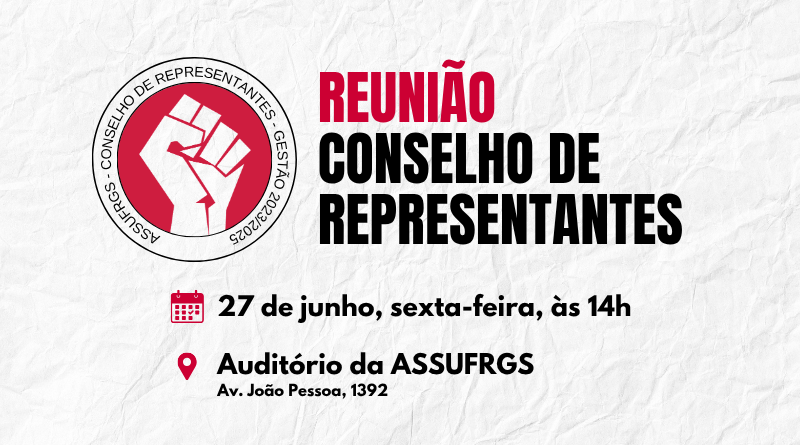A próxima reunião do Conselho de Representantes da ASSUFRGS acontece no próximo dia 27, sexta-feira, às 14h no Auditório da ASSUFRGS (Av. João Pessoa, 1392).