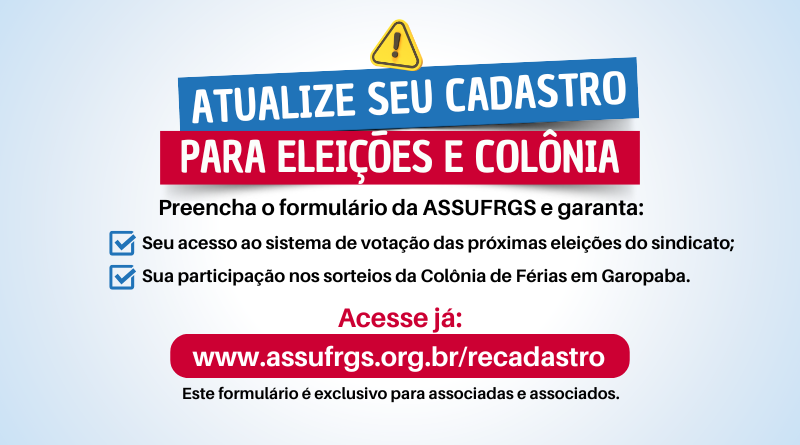 Atenção filiadas(os), faça sua atualização cadastral de associado para as eleições e colônia de férias!