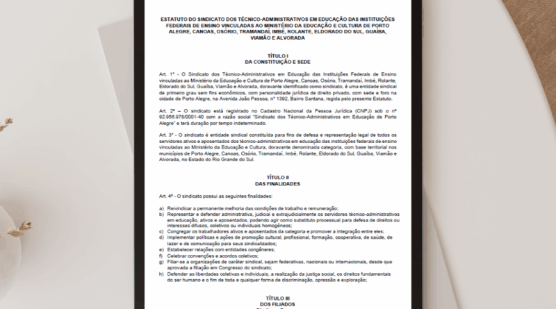 O estatuto da ASSUFRGS Sindicato, atualizado a partir do IV Conassufrgs, já está disponível no site da entidade. O documento foi revisado pela Assessoria Jurídica do sindicato, escritório Rogério Viola Coelho, e passou pelos ajustes necessários na numeração dos artigos, devido às mudanças em comparação ao estatuto anterior. Confira abaixo o documento na íntegra: