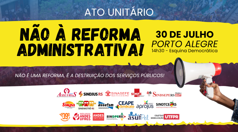 As entidades sindicais, Assufrgs Sindicato, Sindjus RS, Sindimetrô RS, Simpa, Assufsm, AsufPel, Andes/UFRGS, Sindpers, Simpe, Sindsepers, Sindtcers, Aprojus, Ceape-Sindicato, Sinasefe IF Sul, 39º Núcleo do Cpers e Coletivo Mobilização UTFPR estão convocando um ato unitário no próximo dia 30 de julho, às 14h30min, na Esquina Democrática. A agenda une servidores públicos municipais, estaduais e federais.