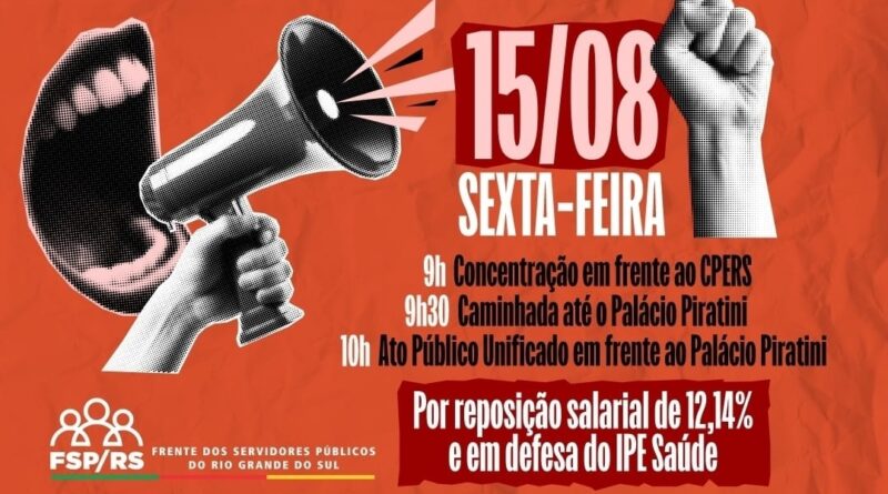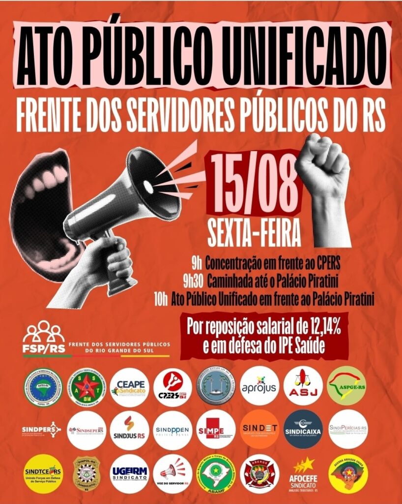 No próximo dia 15 de agosto, sexta-feira, a Frente dos Servidores Públicos do RS (FSP/RS) convoca trabalhadoras e trabalhadores estaduais para um Ato Público Unificado em Porto Alegre. A concentração será às 9h, em frente ao CPERS Sindicato, com caminhada até o Palácio Piratini, onde, às 10h, será realizado o ato central.
