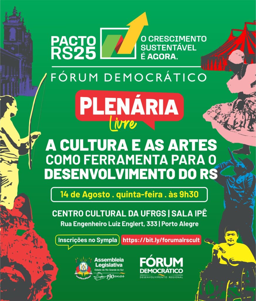 O objetivo é elaborar uma plataforma unificada de propostas do setor cultural, a ser apresentada à sociedade gaúcha, reforçando que a cultura é um pilar essencial para o desenvolvimento econômico e social do estado. A entrada é franca e as inscrições podem ser feitas pelo Sympla no link https://bit.ly/forumalrscult.