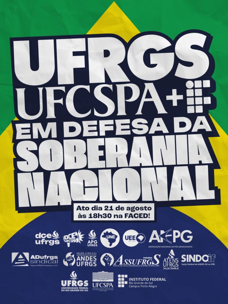 A comunidade universitária da UFRGS, UFCSPA e do IFRS realiza no próximo dia 21 de agosto, quinta-feira, às 18h30min, um ato unitário em defesa da Soberania Nacional. A mobilização ocorrerá em frente à Faculdade de Educação da UFRGS (FACED) e é convocada pelas entidades representativas de servidores e estudantes das instituições. Entre elas: ASSUFRGS Sindicato, DCE UFRGS, DCE UFCSPA, APG UFRGS, UNE, UEE/RS, ANPG, ANDES UFRGS, Adufrgs Sindical, Atens UFRGS, SindoIF. O chamado conta com o apoio das reitorias da UFRGS, UFCSPA e da Direção do Campus Porto Alegre do IFRS.