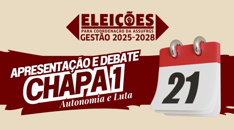 A Comissão Eleitoral convida todos os filiados e filiadas para um momento essencial da nossa democracia sindical: a apresentação e debate com a Chapa 01 – Autonomia e Luta, que concorre à Coordenação da ASSUFRGS nas eleições marcadas para o dia 28 de agosto.