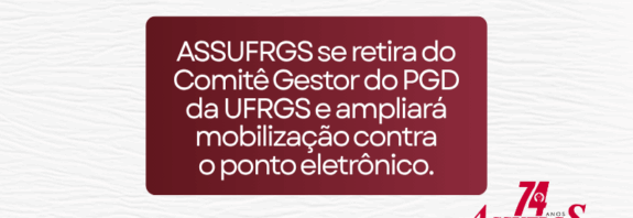 A ASSUFRGS Sindicato comunica à categoria de Técnicos Administrativos em Educação (TAEs) da UFRGS sua decisão de se retirar do … Continue lendo ASSUFRGS se retira do Comitê Gestor do PGD da UFRGS e ampliará mobilização contra o ponto eletrônico