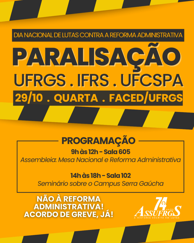 A ASSUFRGS Sindicato convoca para o dia 29 de outubro, próxima quarta-feira, a PARALISAÇÃO de 24 horas na UFRGS, UFCSPA e IFRS. A data será marcada por mobilizações em todo o país contra a Reforma Administrativa, que teve nova proposta apresentada no Congresso Nacional e que, por parte do Governo Federal, vem sendo implementada por meio de normativas do Ministério da Gestão e da Inovação em Serviços Públicos (MGI).