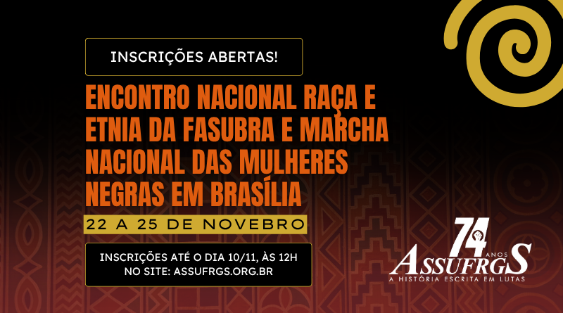 A ASSUFRGS Sindicato, através da Coordenação de Diversidade e Combate às Opressões abre as inscrições para a categoria participar de duas importantes atividades em Brasília. O Encontro Nacional de Raça e Etnia da FASUBRA, que inicia no dia 22 de novembro, e a Marcha Nacional das Mulheres Negras por Reparação e Bem Viver, que ocorre no dia 25 de novembro.