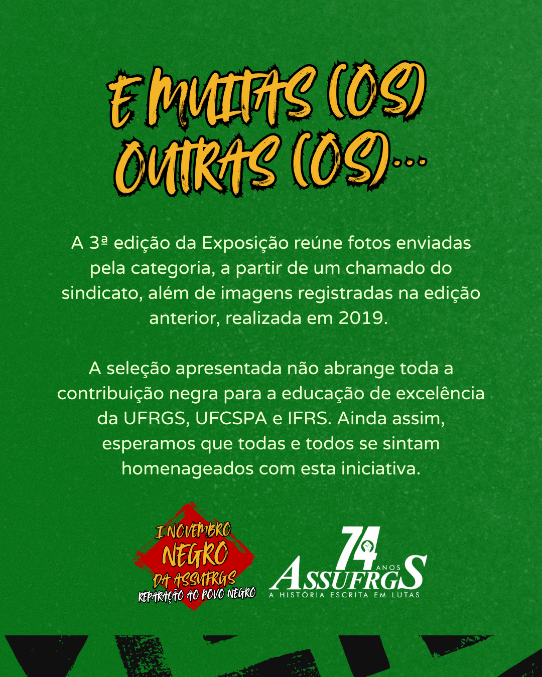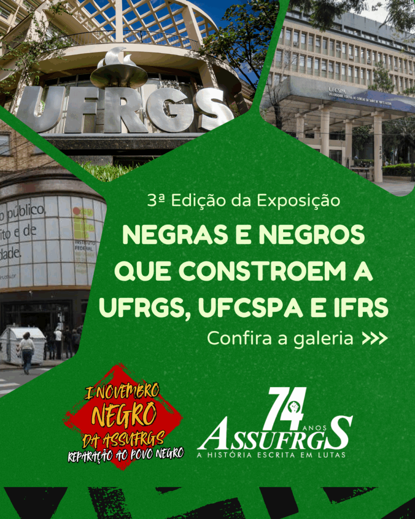 Como parte da programação do I Novembro Negro da ASSUFRGS: Reparação ao Povo Negro, a Coordenação de Diversidade e Combate às Opressões realiza a 3ª Edição da Exposição Negros e Negras que Constroem a UFRGS, UFCSPA e IFRS. Neste ano, a exposição está em formato virtual, composta por fotos enviadas pela categoria, a partir de um chamado do sindicato, além de imagens registradas na edição anterior, realizada em 2019.