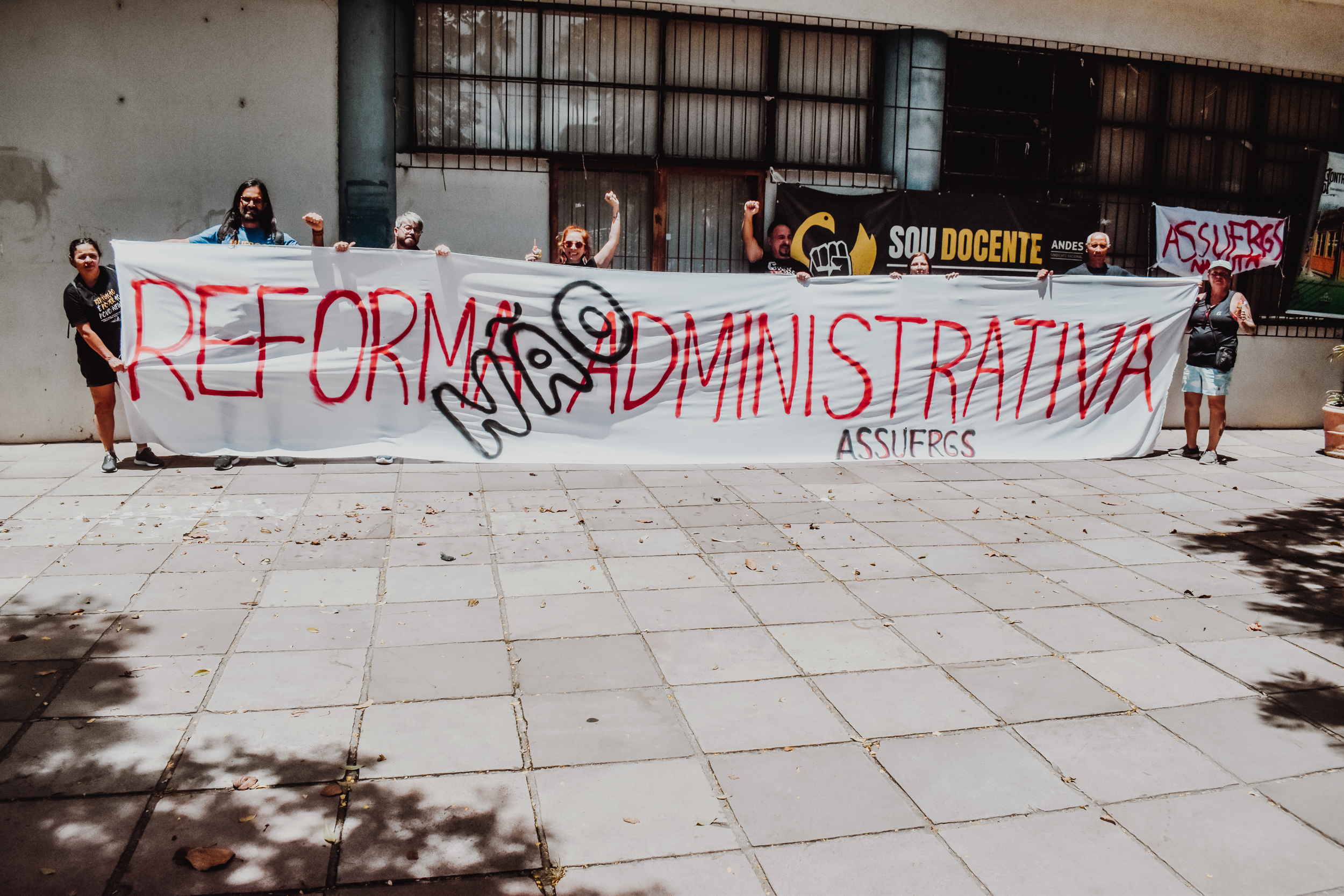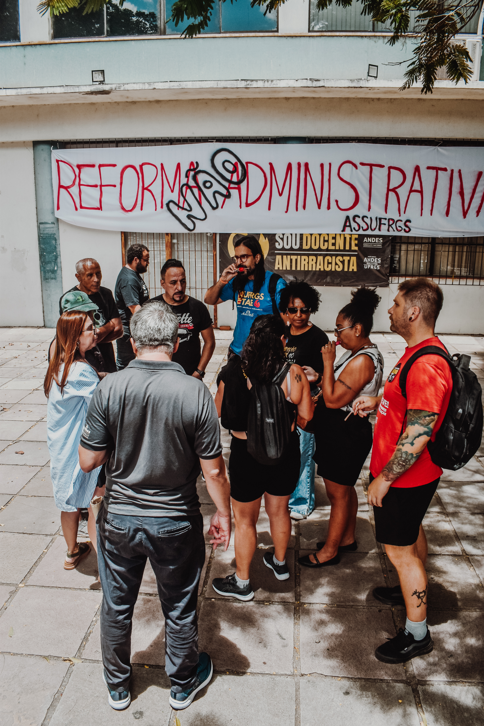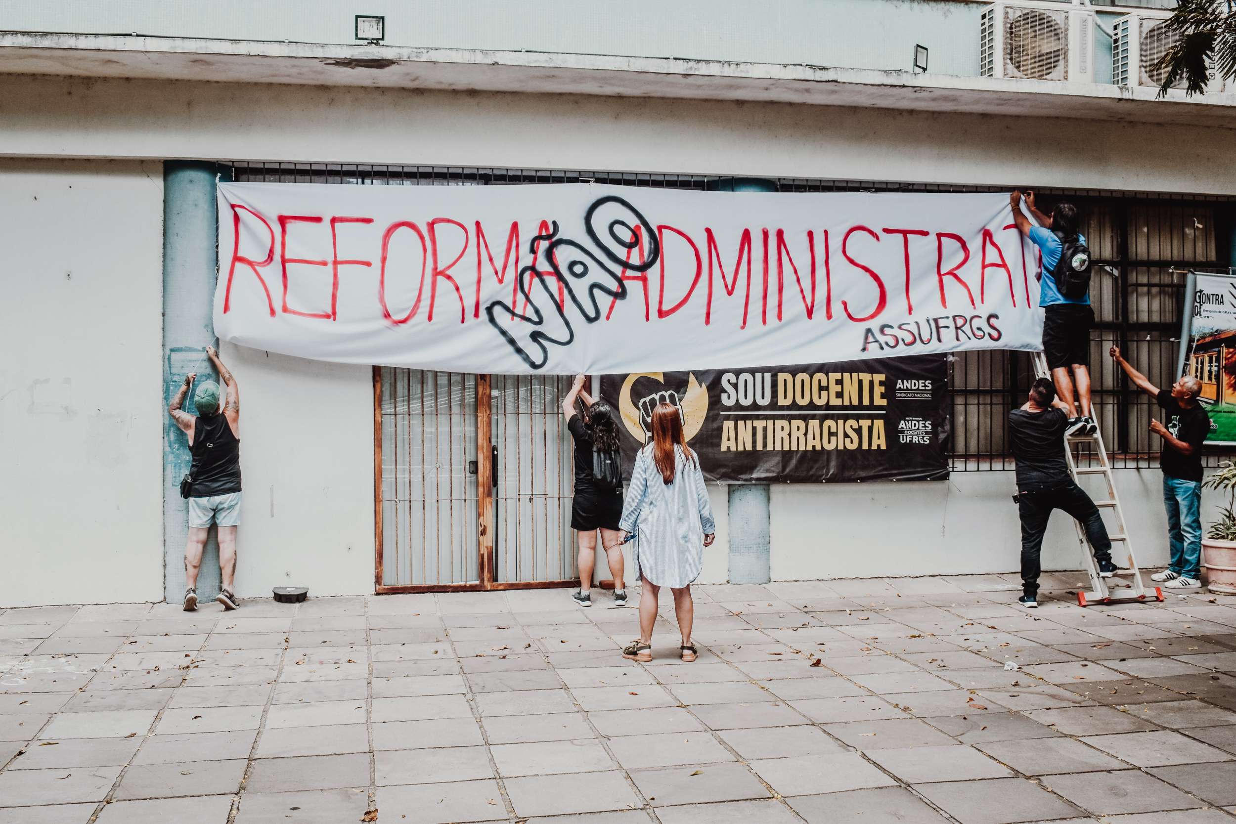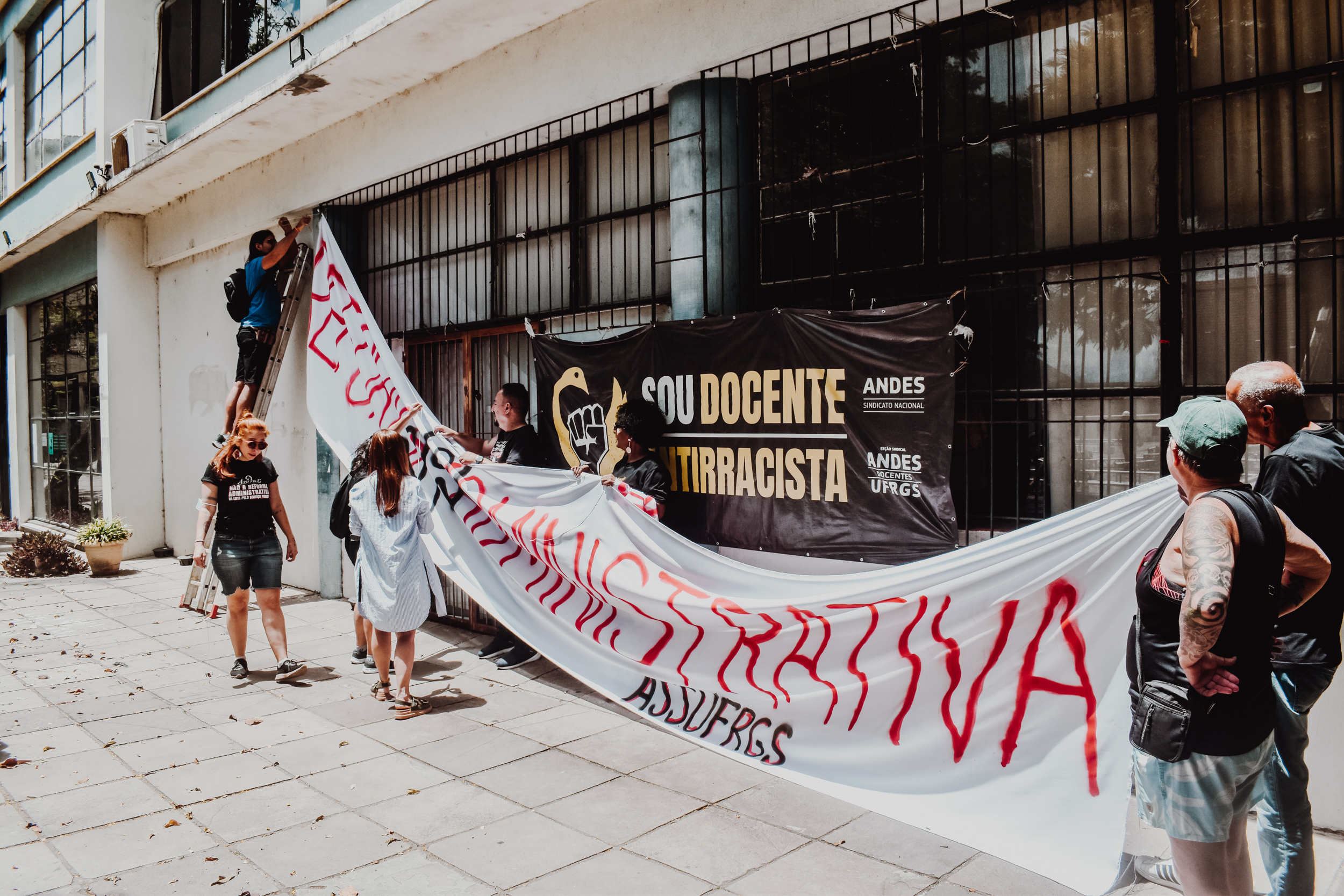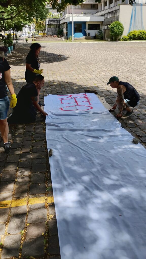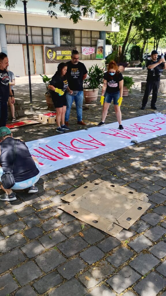 Às 11h, a mobilização ganhou visibilidade no Campus Centro da UFRGS, no entorno da FACED, com a confecção de faixas ao ar livre. Servidores e servidoras produziram materiais que expressaram reivindicações em defesa da universidade pública, do cumprimento do Acordo de Greve e de um RSC construído com a categoria.