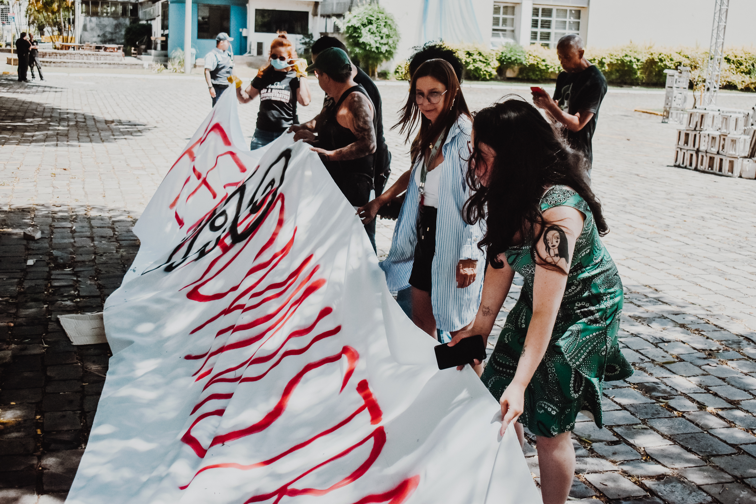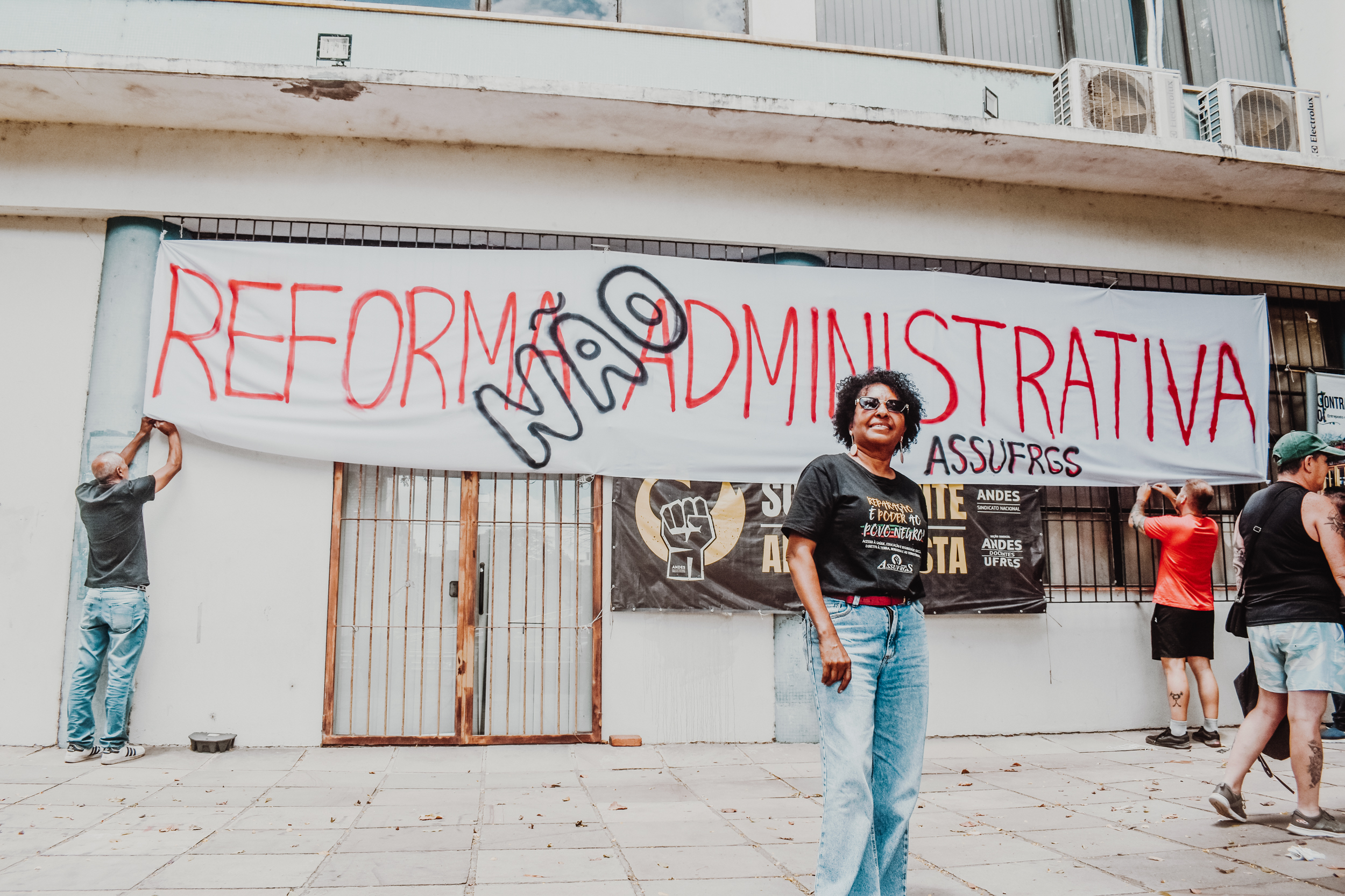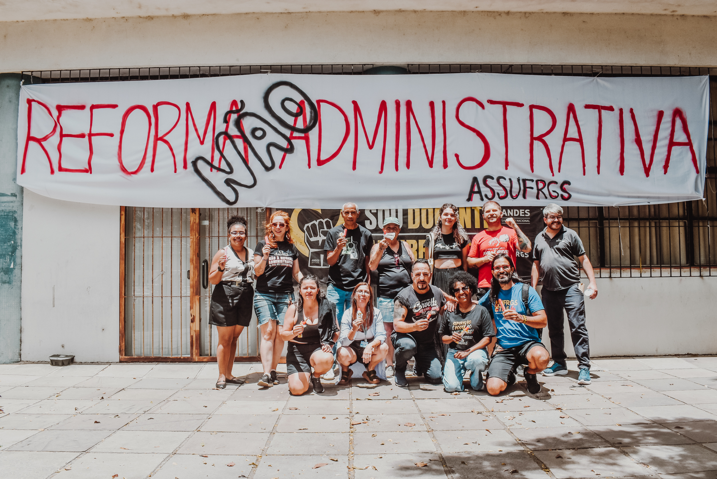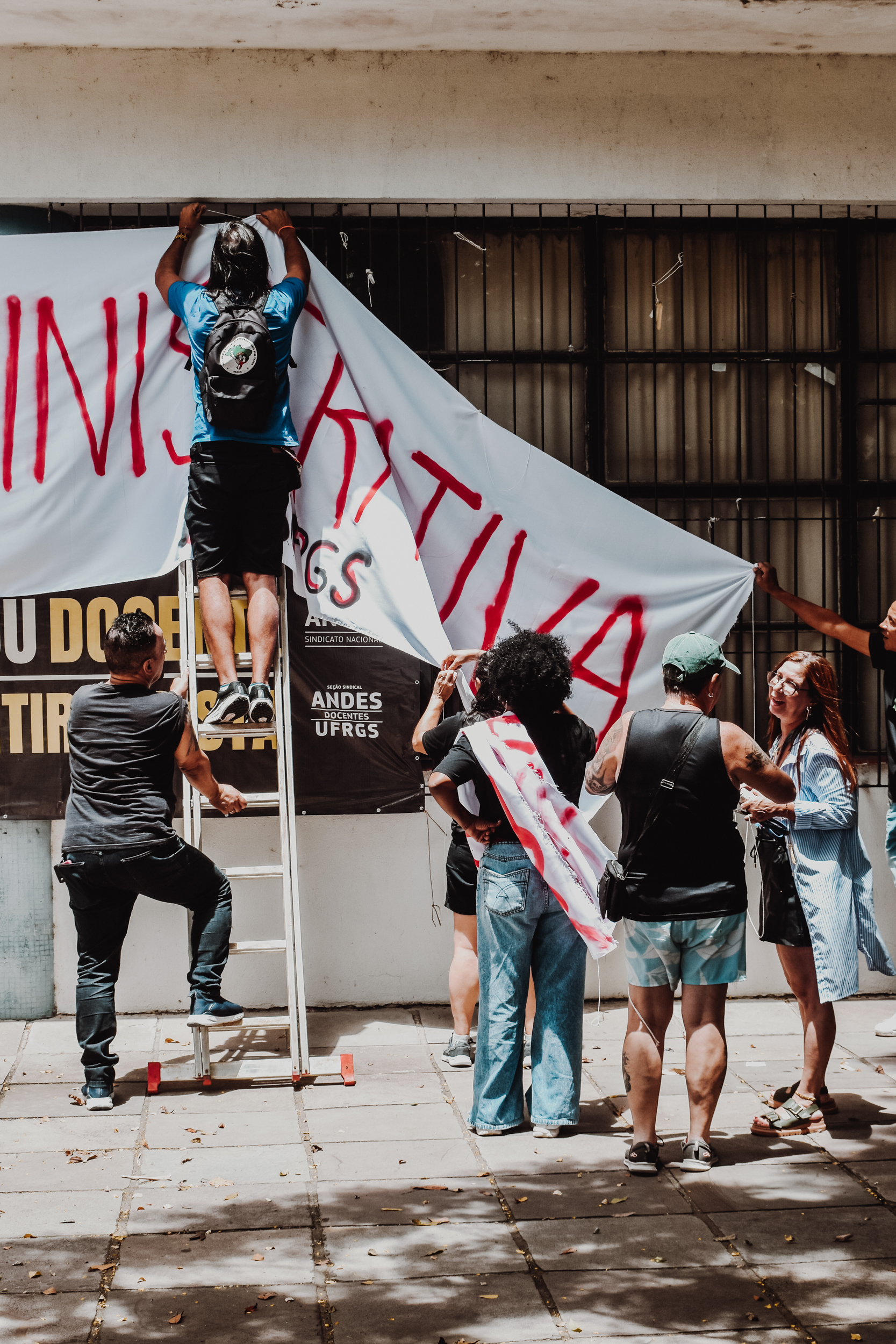 Às 11h, a mobilização ganhou visibilidade no Campus Centro da UFRGS, no entorno da FACED, com a confecção de faixas ao ar livre. Servidores e servidoras produziram materiais que expressaram reivindicações em defesa da universidade pública, do cumprimento do Acordo de Greve e de um RSC construído com a categoria.