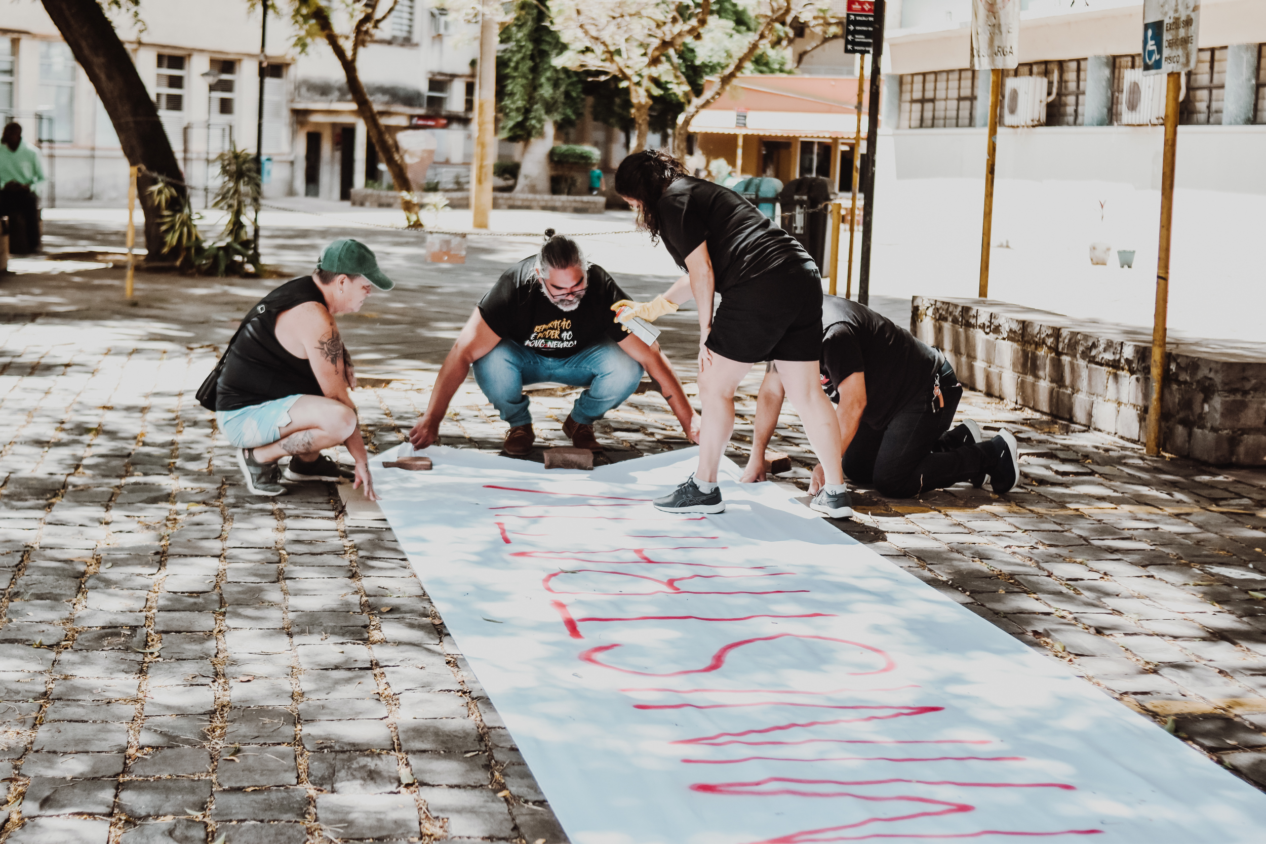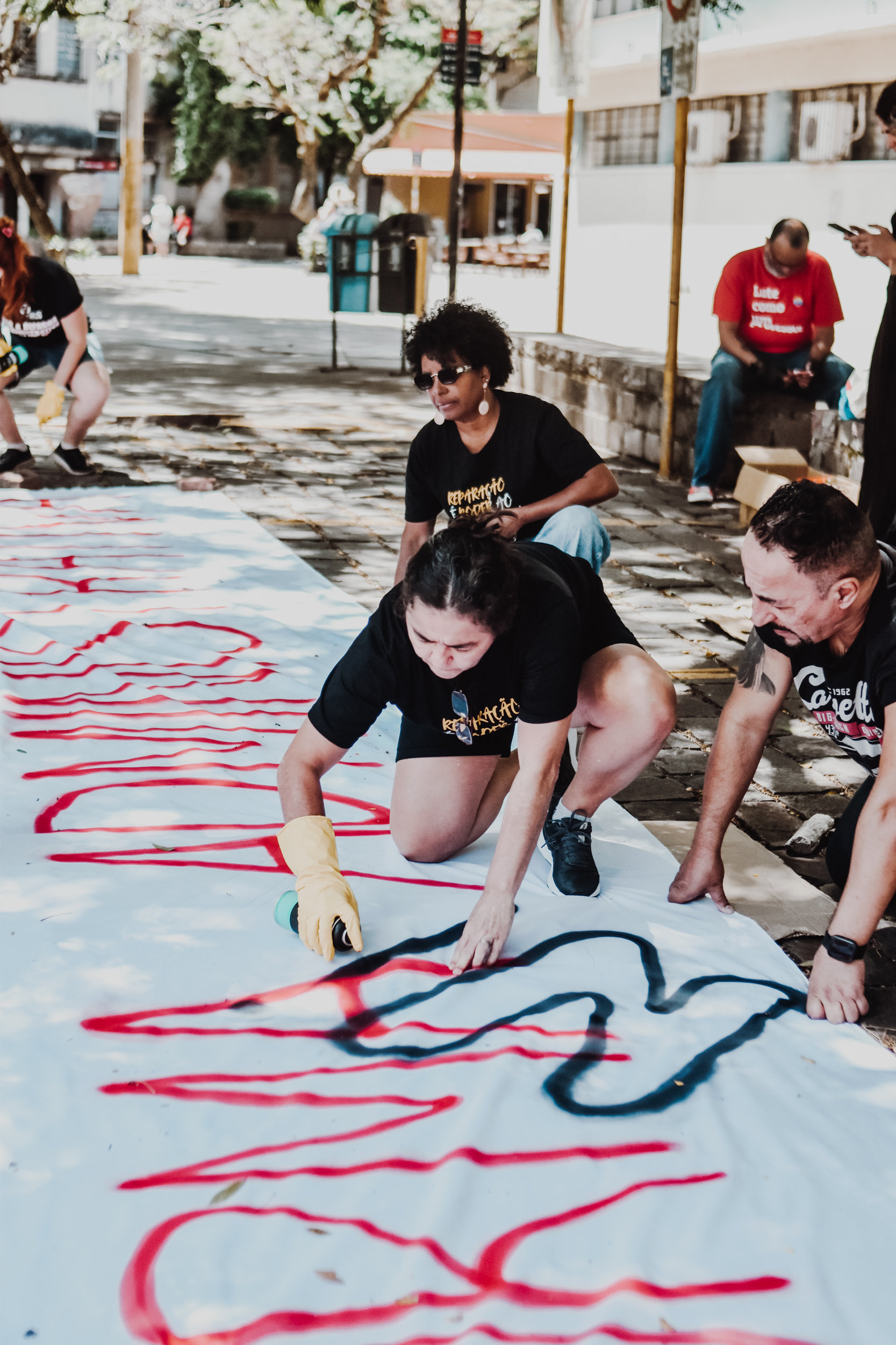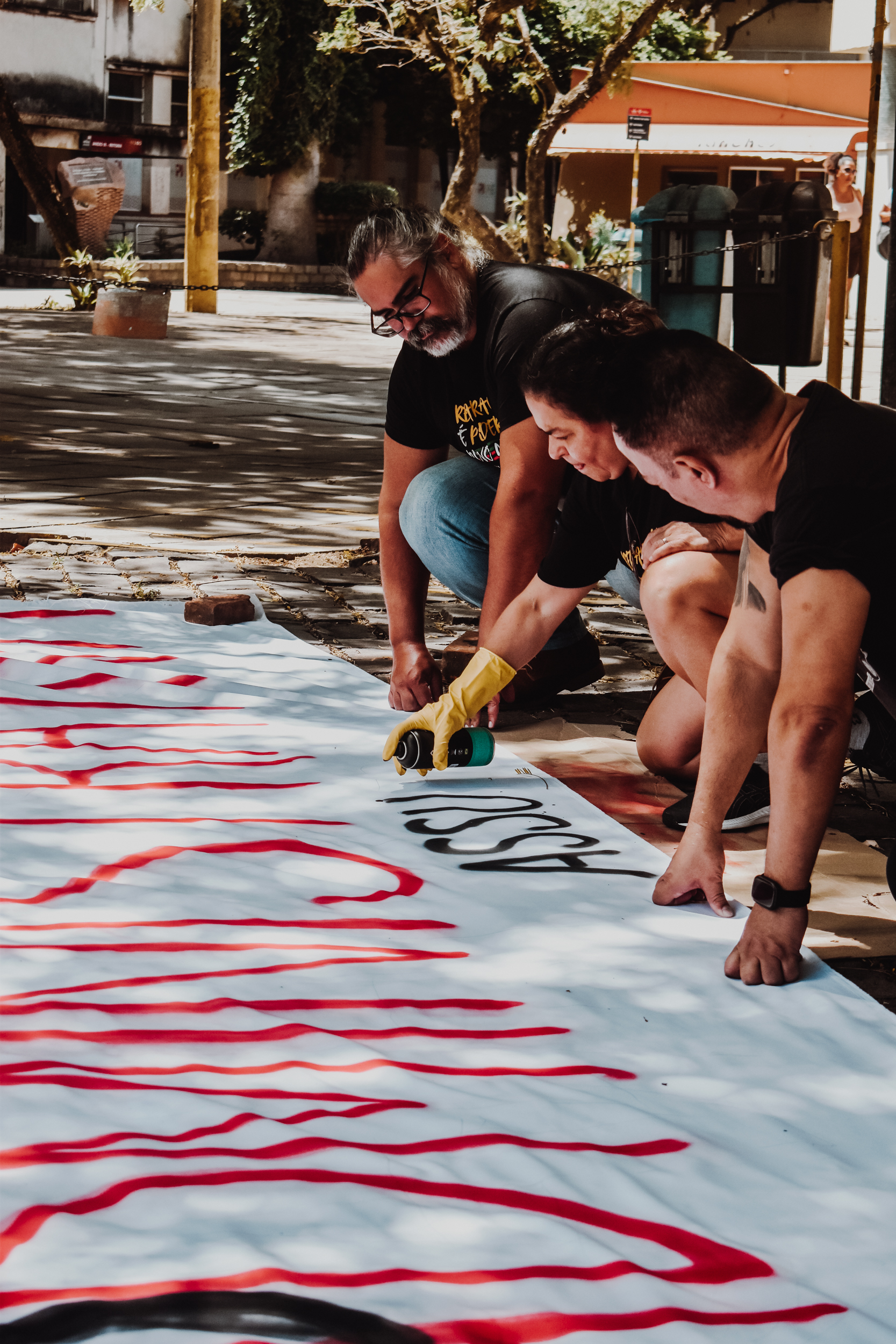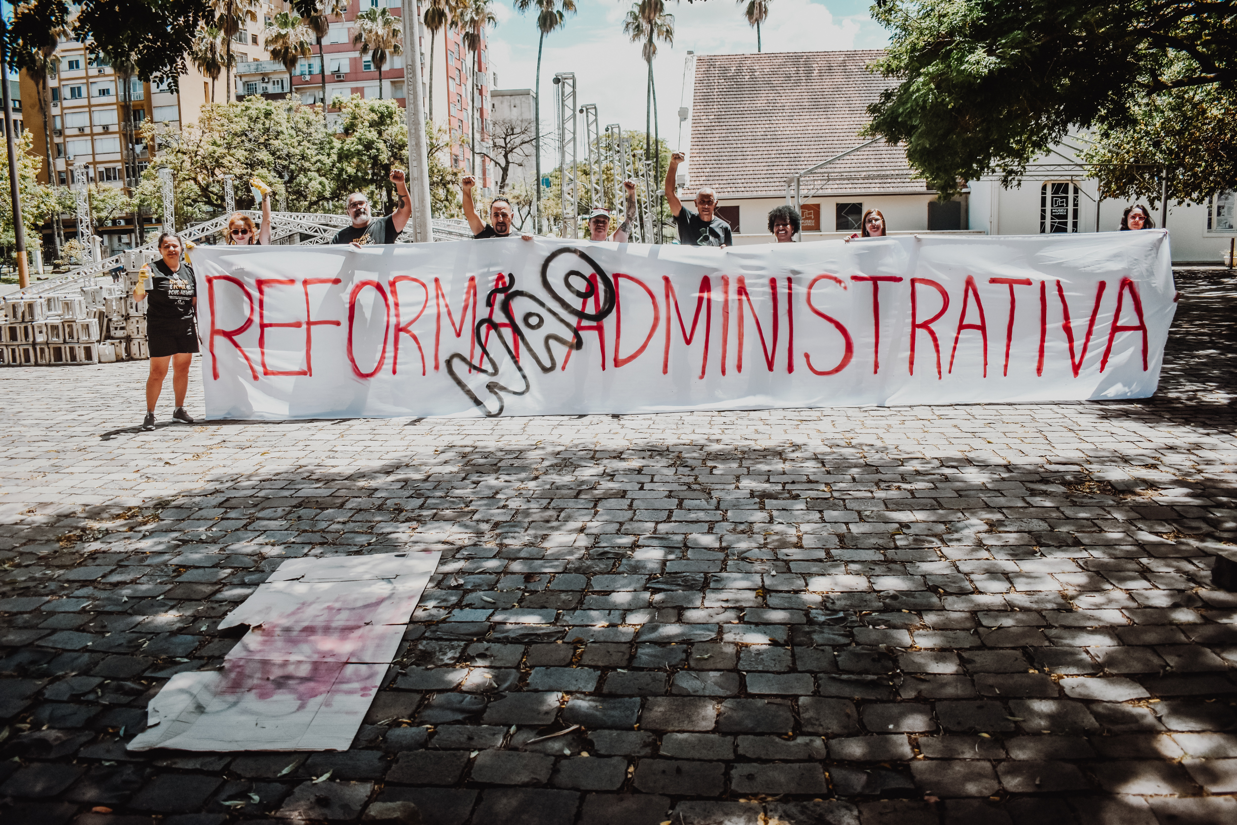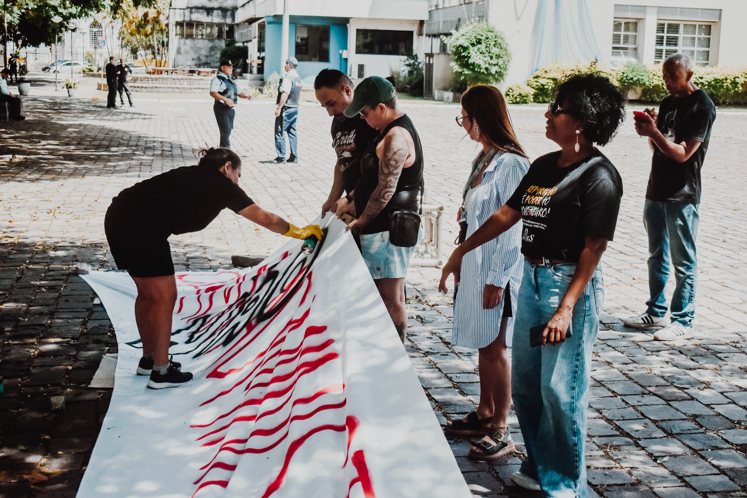 Às 11h, a mobilização ganhou visibilidade no Campus Centro da UFRGS, no entorno da FACED, com a confecção de faixas ao ar livre. Servidores e servidoras produziram materiais que expressaram reivindicações em defesa da universidade pública, do cumprimento do Acordo de Greve e de um RSC construído com a categoria.