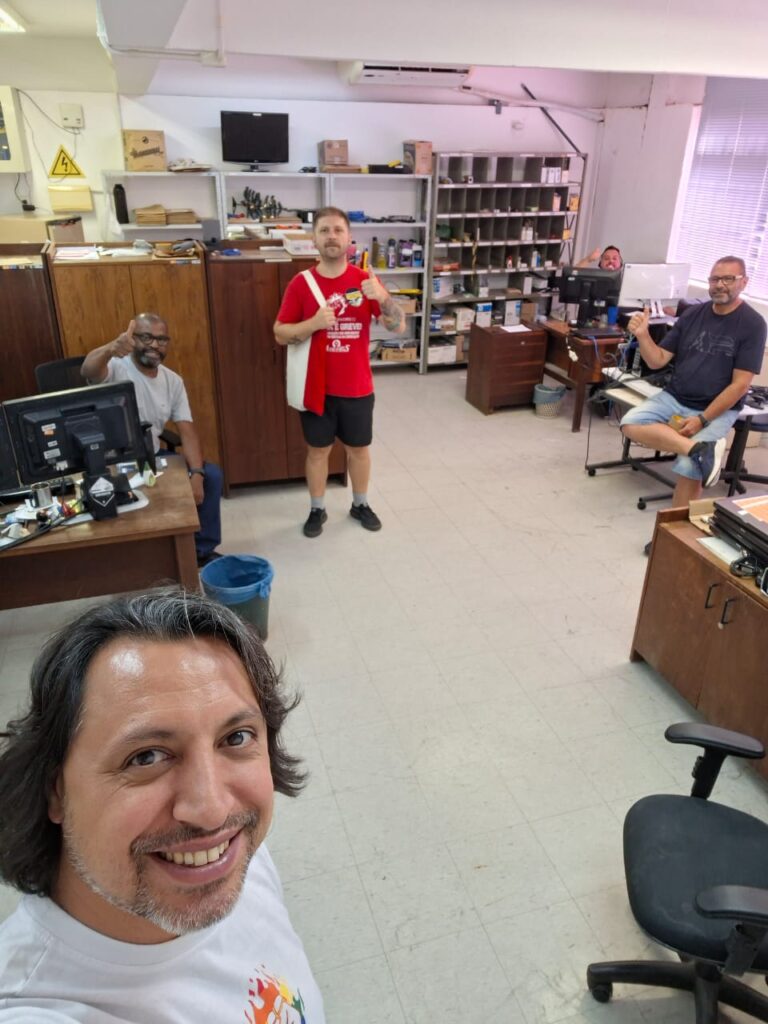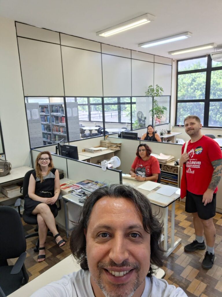 Desde o início da manhã, dirigentes sindicais e representantes da ASSUFRGS circularam por setores da UFRGS, UFCSPA e IFRS para dialogar com os colegas, esclarecer dúvidas e fortalecer a organização coletiva. A passagem nos locais de trabalho foi marcada por conversas sobre o cenário de cortes orçamentários de 7% nas instituições federais e sobre os riscos trazidos pela PEC 38, atual texto da Reforma Administrativa.
