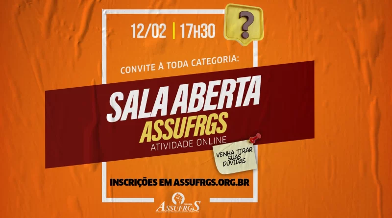 Notícia Inscrições Sala Aberta Assufrgs 11 de fevereiro de 2026 Imprensa Assufrgs Evento online, faça sua inscrição no formulário abaixo para receber o link de participação na atividade Carregando…